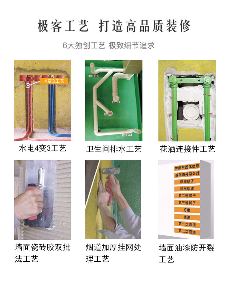 華美樂全國首家全屋使用界面劑加固工藝,有效增強原基礎沙漿層的強度。同時增加原墻的附著力,刷漆或貼磚更加牢固華美樂獨創(chuàng)墻面掛網工藝,墻面批第一遍膩子干透前,對原墻面的開裂進行修復,然后全屋滿布玻璃纖維網,再批第二遍膩子覆蓋。