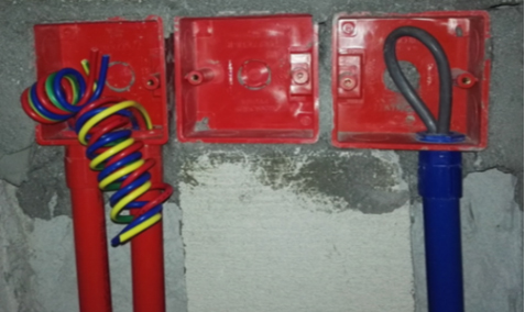 1、紅藍(lán)線管分開布設(shè),間距30CM,紅色線管布強(qiáng)電,藍(lán)色線管布弱電; 2、線管敷設(shè)離墻30CM,盡可能減少彎曲次數(shù),彎管時(shí)需用彎管器,彎的弧度為管徑的8~10倍,且不得彎扁,弧度必須大于90度; 3、線管的布設(shè)排布清晰、有序,且方向一致,不得斜拉亂走,禁止繞線。