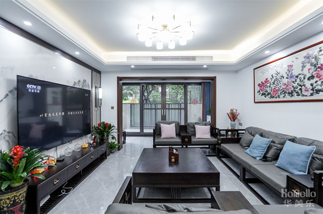 3、客廳的打造的水墨風(fēng)讓人一眼就能感受到新中式與現(xiàn)代風(fēng)結(jié)合出來的雅致與貴氣,擁有美感的同時(shí)不失實(shí)用性。