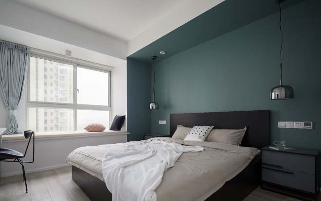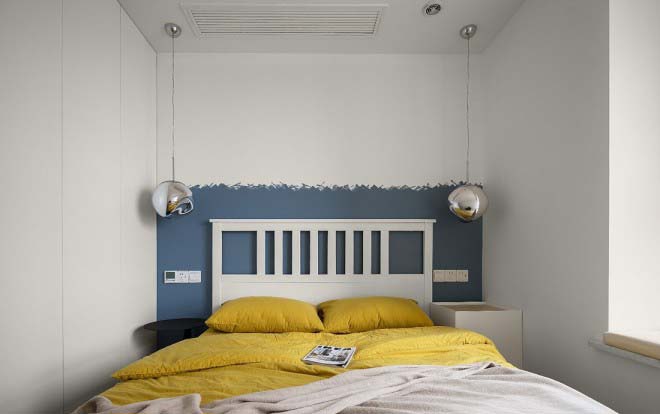 主臥空間簡(jiǎn)約舒適,藍(lán)色系與白色系營(yíng)造出舒緩放松的氣氛,布藝雙人床配合柔軟的大地色系紡織品,產(chǎn)生一種溫暖的力量將人包裹。靠墻處放置了桌子,女屋主可以在這里梳妝,或是睡前看看書(shū)。