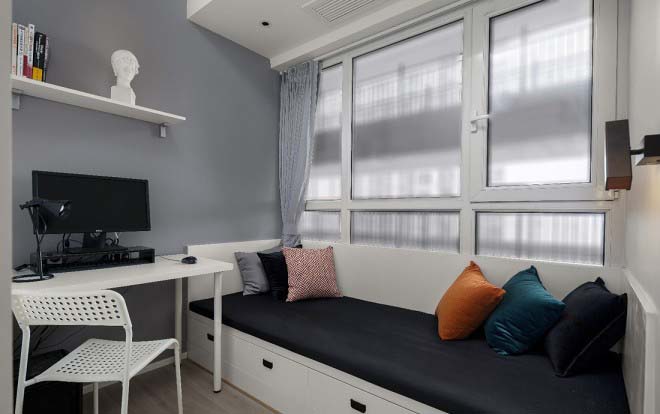 多功能書(shū)房配置了榻榻米床,平時(shí)可以當(dāng)沙發(fā)使用,有客人留宿時(shí)也可以當(dāng)作單人床,抽屜還具有強(qiáng)大的儲(chǔ)物功能。宜家書(shū)桌、椅子、擱板,組成了男屋主怡然自得的小天地,忙完一天的工作,在這里玩玩游戲、聽(tīng)聽(tīng)歌,什么都不想,真正放空大腦。
