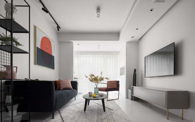 考慮到空間面積偏狹小,因此硬裝偏向簡(jiǎn)約。頂面采用局部吊頂,配合明裝射燈、筒燈,更顯簡(jiǎn)潔大氣。沒(méi)有擺放過(guò)多的家具,只選用了輕盈的三人位沙發(fā),單人沙發(fā)、鐵藝置物架,留出更多的空間自由活動(dòng)。