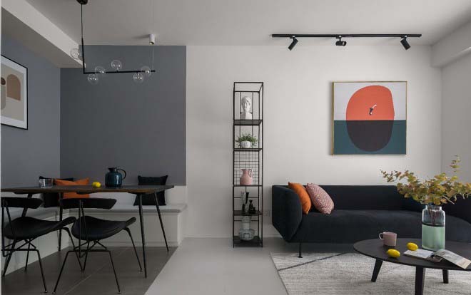 客餐廳之間采用乳膠漆分色處理,地面也通過(guò)瓷磚顏色劃分出空間區(qū)域,讓空間更富有趣味性。跳躍的色彩不僅能活躍空間的氛圍,還能調(diào)動(dòng)居住者的情緒,讓家活潑生動(dòng)!客餐廳均選用細(xì)線(xiàn)條的家具,例如細(xì)腿沙發(fā)、細(xì)腿電視柜、細(xì)腿餐桌椅… 讓小空間更輕盈靈動(dòng)。