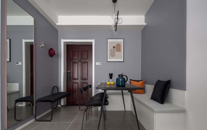 考慮到入戶(hù)區(qū)域較為狹窄,摒棄了傳統(tǒng)頂天立地的大鞋柜,采用L形的卡座,滿(mǎn)足鞋子收納的同時(shí),也便于多人同時(shí)就餐??繅σ粋?cè)安裝了掛鉤、全身鏡,還配置了換鞋凳,以后有了小孩,居住人口變多,還可以將換鞋凳搬走,購(gòu)買(mǎi)薄款鞋柜,擴(kuò)充儲(chǔ)物空間。
