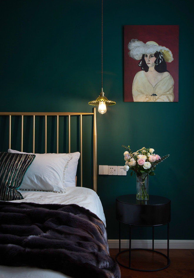▲時(shí)尚就是一個(gè)輪回,墨綠色的墻面,原本多見(jiàn)于五六十年代,近年卻復(fù)古回潮,深受喜愛(ài)。主臥使用了深邃的暗色調(diào),整面的墨綠色墻面奠定復(fù)古基調(diào),金色豎紋床架線條流暢簡(jiǎn)潔,金色和墨綠色搭配的抱枕前后遞進(jìn),墻上則選擇了野獸派創(chuàng)始人亨利·馬蒂斯的古典肖像畫(huà)。