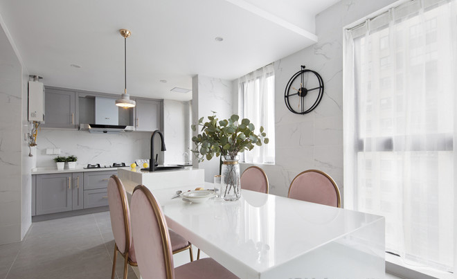 ▲餐廳與廚房在同一個(gè)空間里,延續(xù)了基礎(chǔ)色調(diào),白色大理石的空間,幾張粉色的餐椅,調(diào)和空間溫暖的氛圍。設(shè)計(jì)師精心的挑選了室內(nèi)的每一件家飾。