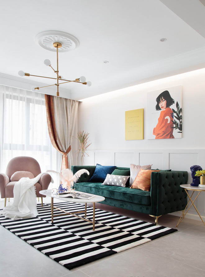 ▲客廳空間以純凈的白色作為主體色,復(fù)古的墨綠絲絨沙發(fā),被簡(jiǎn)約的淺灰色半護(hù)墻襯托的更加醒目。電視背景墻并未做過(guò)多復(fù)雜的處理,簡(jiǎn)單的PU線條帶出些許的造型感。白色的電視柜,表面采用蜂窩紋的設(shè)計(jì),十分別致和出挑。搭配精致的金色擺設(shè),令空間感受更為飽滿(mǎn)。