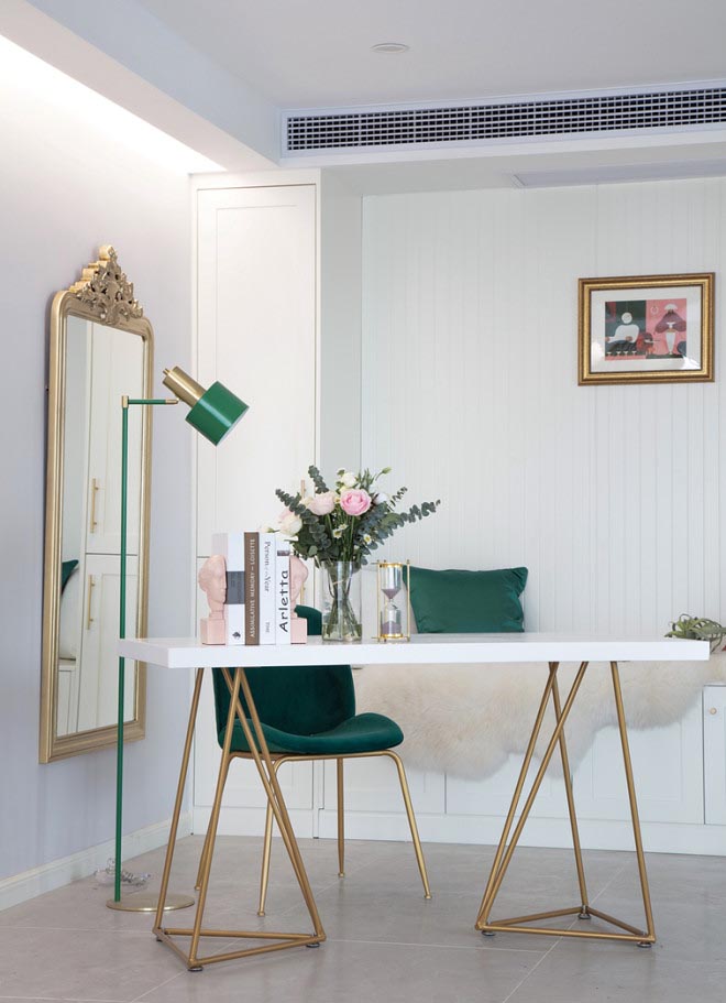 ▲一個(gè)人的家,書(shū)房就采用開(kāi)放式的,不會(huì)因?yàn)楦魯嗥茐目臻g整體的美感。一張桌子、一把絨面椅,金色、白色和墨綠色的調(diào)和凸顯了質(zhì)感。置于左側(cè)墻面的復(fù)古雕花鏡,讓這個(gè)閱讀區(qū)兼?zhèn)淞嘶瘖y臺(tái)的功能。卡座和柜體的設(shè)計(jì),在解決儲(chǔ)物的同時(shí),也增加了一個(gè)小小的休閑區(qū)。