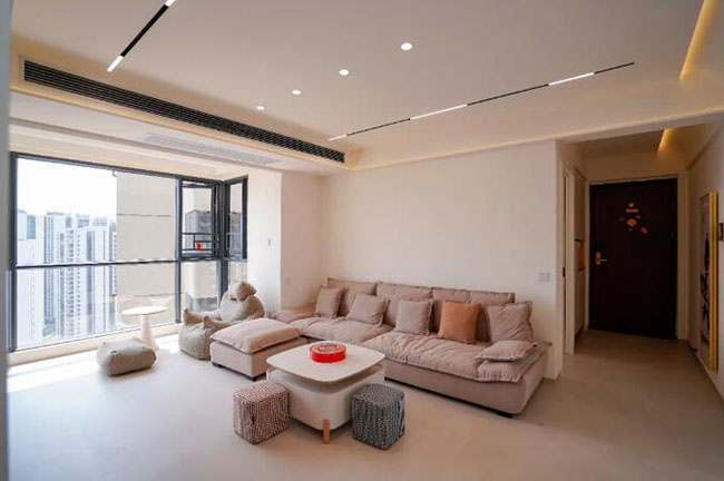 客廳整體設(shè)計以淺咖為主,色調(diào)柔和不刺眼,適合營造出溫馨舒適的居住氛圍。地面進行瓷磚通鋪,搭配無主燈吊頂,陽臺落地窗戶給室內(nèi)提供自然采光和創(chuàng)造室外視野,邊上安置小茶幾,可以閑暇時小憩。享受慢生活時光,空間感滿滿,給人干凈利落的感覺。