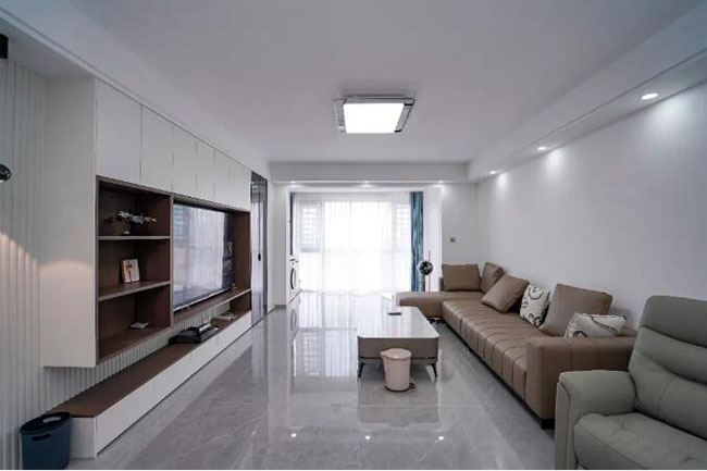 巖板茶幾選用傳統(tǒng)的長方形圓角結(jié)構(gòu),圓潤的流線外加抽屜柜,主打一個(gè)實(shí)用。電視墻以白色木飾面為底,表層打造電視一體柜,兩側(cè)打造開放式格子柜和玻璃柜方便擺放提升空間格調(diào)裝飾,同時(shí)兼顧顏值與實(shí)用性。
