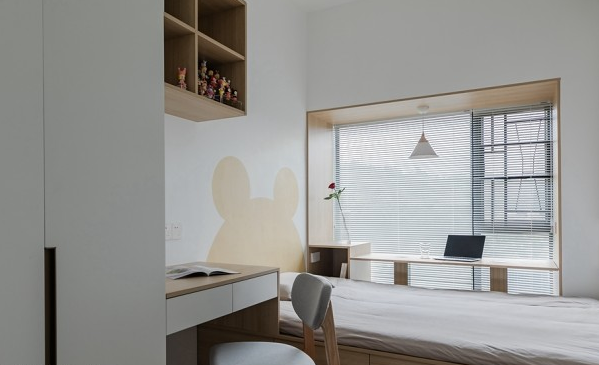 兒童房用原木+灰色搭配,溫馨有助睡眠,榻榻米的設(shè)計很是實用,收納實力很強。