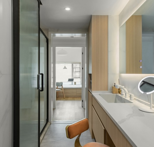 三分離的衛(wèi)生間,乾區(qū)定制的外置洗漱臺,緩解了一家人在早晚高峰的擁擠。