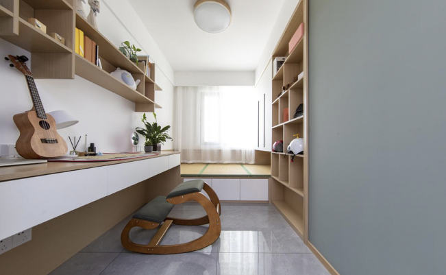 書房右手邊墻刷的是與次臥室一樣的頁(yè)巖綠,既保持了整個(gè)房間風(fēng)格統(tǒng)一,也給書房增添了活潑的氣息。