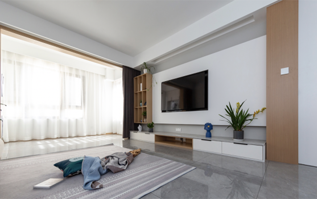 客廳采用的是無主燈的設(shè)計(jì),考慮到預(yù)算,沒有整體做吊頂及做暗裝的筒燈和射燈,而選擇的是明裝的,效果還是蠻不錯(cuò)的,客廳中間去掉了不常用的茶幾,通過性更加的好,也感覺空間很寬敞,鋪上一塊大大的地毯,可以滿足P太太平時(shí)健身練瑜伽的需要