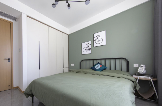 頁(yè)巖綠色的背景墻,白色的衣柜,黑色的鐵架床,一個(gè)小茶幾用來充當(dāng)床頭柜,再加上墻上簡(jiǎn)單干凈的兩幅畫,滿滿的高級(jí)感