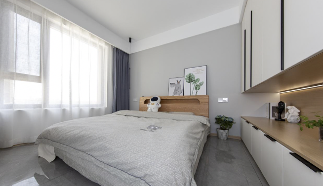 整體色調(diào)延續(xù)了客廳的風(fēng)格,背景墻為灰色調(diào),更加襯托了空間的高級(jí)感,既簡(jiǎn)約而又不與眾不同,再搭配著原木色彰顯著高雅溫馨的氛圍,相信在這樣的環(huán)境下入眠,一定會(huì)有一個(gè)好夢(mèng)吧!