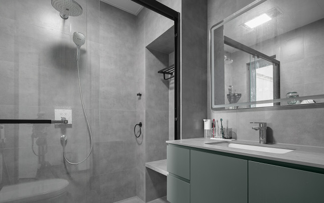 衛(wèi)生間選用灰色磚做墻地一體鋪貼,以增加空間延伸感。低飽和度綠色的浴室柜則讓空間更顯高級感。
